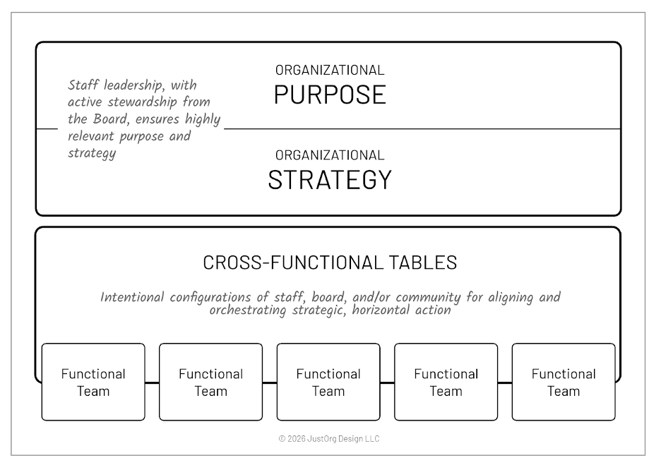 There are alternative ways to approach structure, and its graphic representation, in a justice-centered nonprofit. In the visual below, for instance, organizational purpose and strategy, stewarded by board and staff leadership, sit atop the image to emphasize that it is purpose and strategy that drive organizational structure and decision-making. Next is a layer of cross-functional tables, some of which will shift in emphasis as strategy shifts, allowing intentional configurations of staff, board, and/or community to align horizontally. And finally, functional teams drive the distinct, recurring bodies of work.